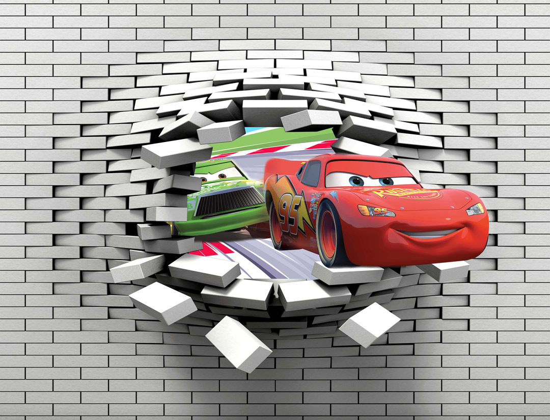 3D foto tapeta sa motivima iz crtanog filma Cars stvara snažan i dinamičan efekat.