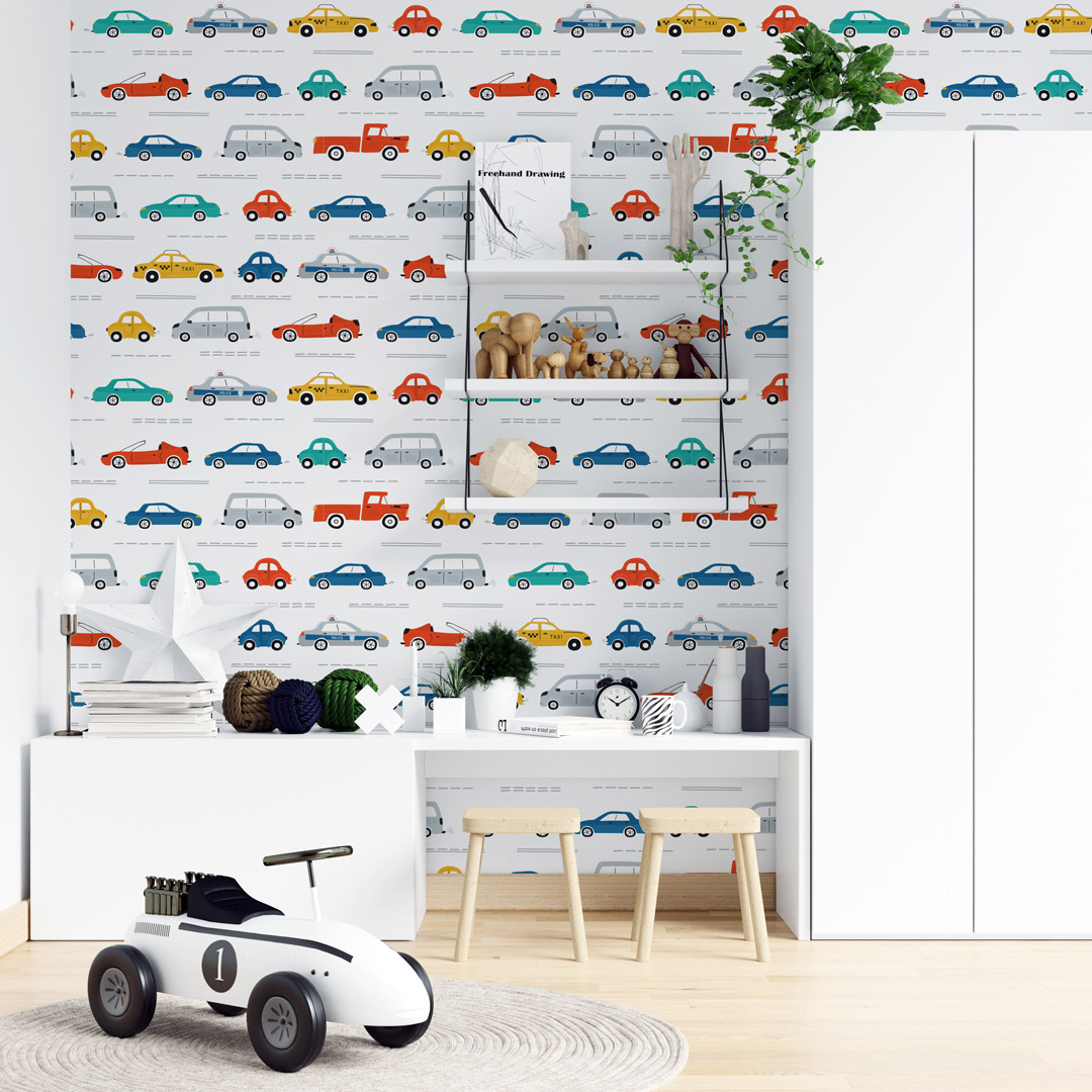 Dečija foto tapeta sa motivima autića namenjena je razigranom i dinamičnom uređenju prostora.