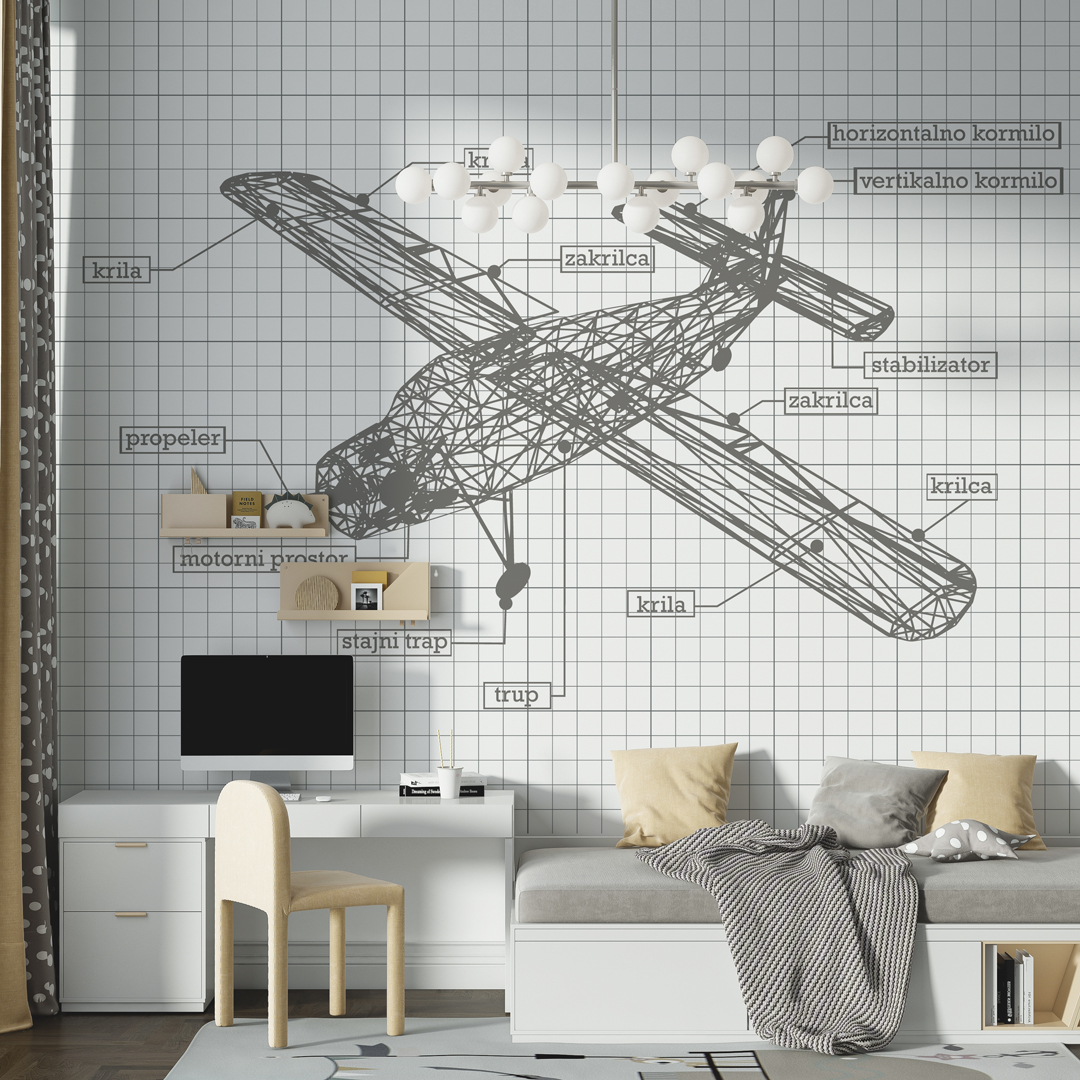 Foto tapeta sa motivom aviona namenjena je dečijim sobama i prostorima za igru. Dizajn inspiriše maštu, putovanja i avanturu, uz vedar i razigran vizuelni stil.