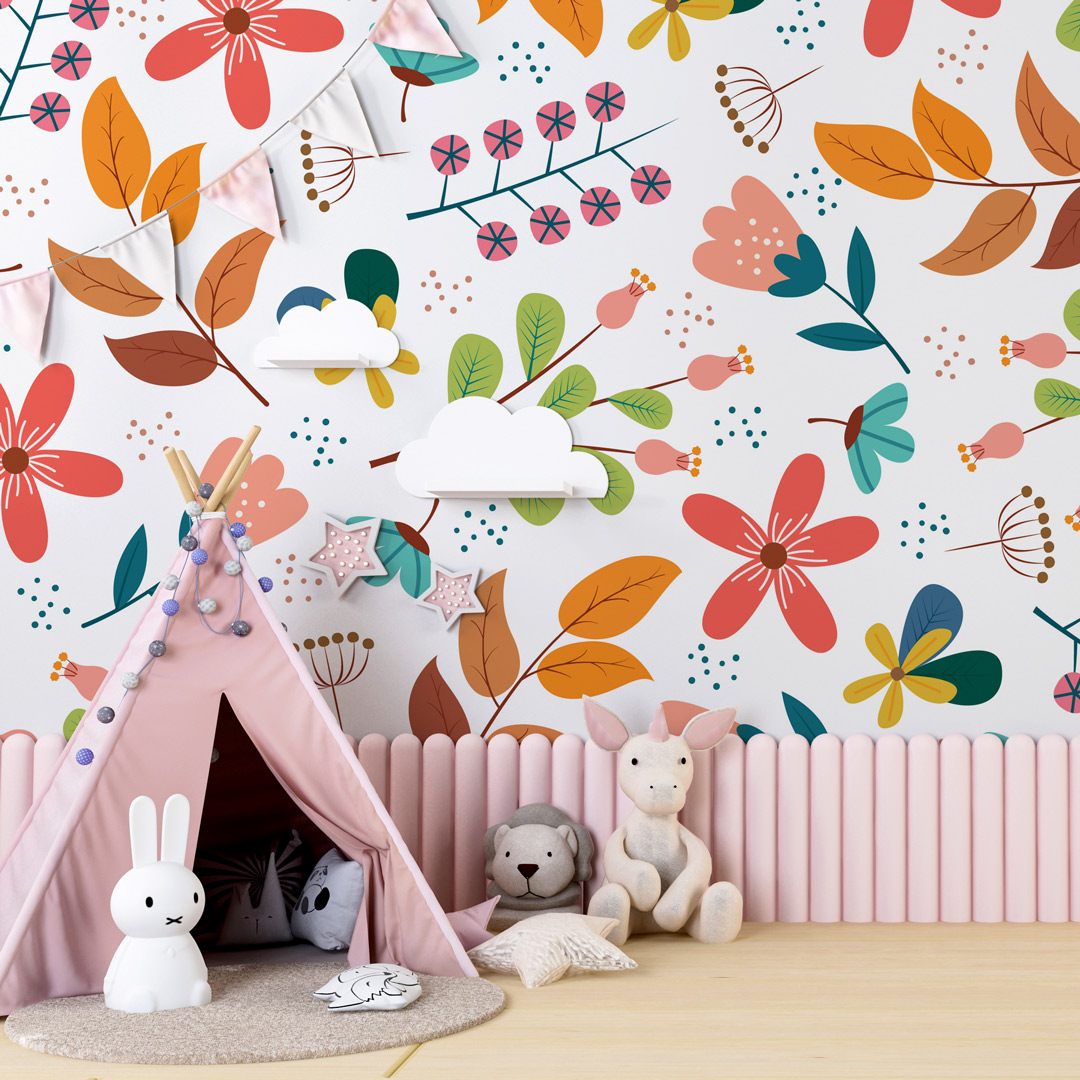 Dečiji patern sa lišćem i cvećem unosi prirodnu svežinu u prostor.