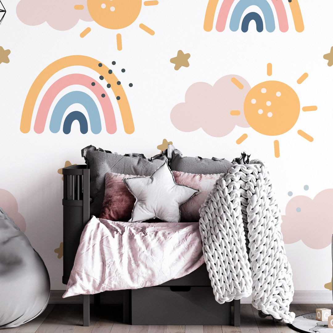 Dečiji patern sa dugama, oblacima i suncem unosi vedrinu i pozitivnu energiju u prostor.