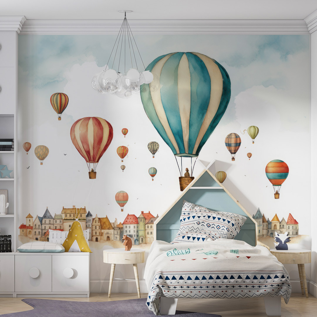 Foto tapeta sa šarenim balonima u patern dizajnu unosi vedrinu i lakoću u dečiji prostor.
