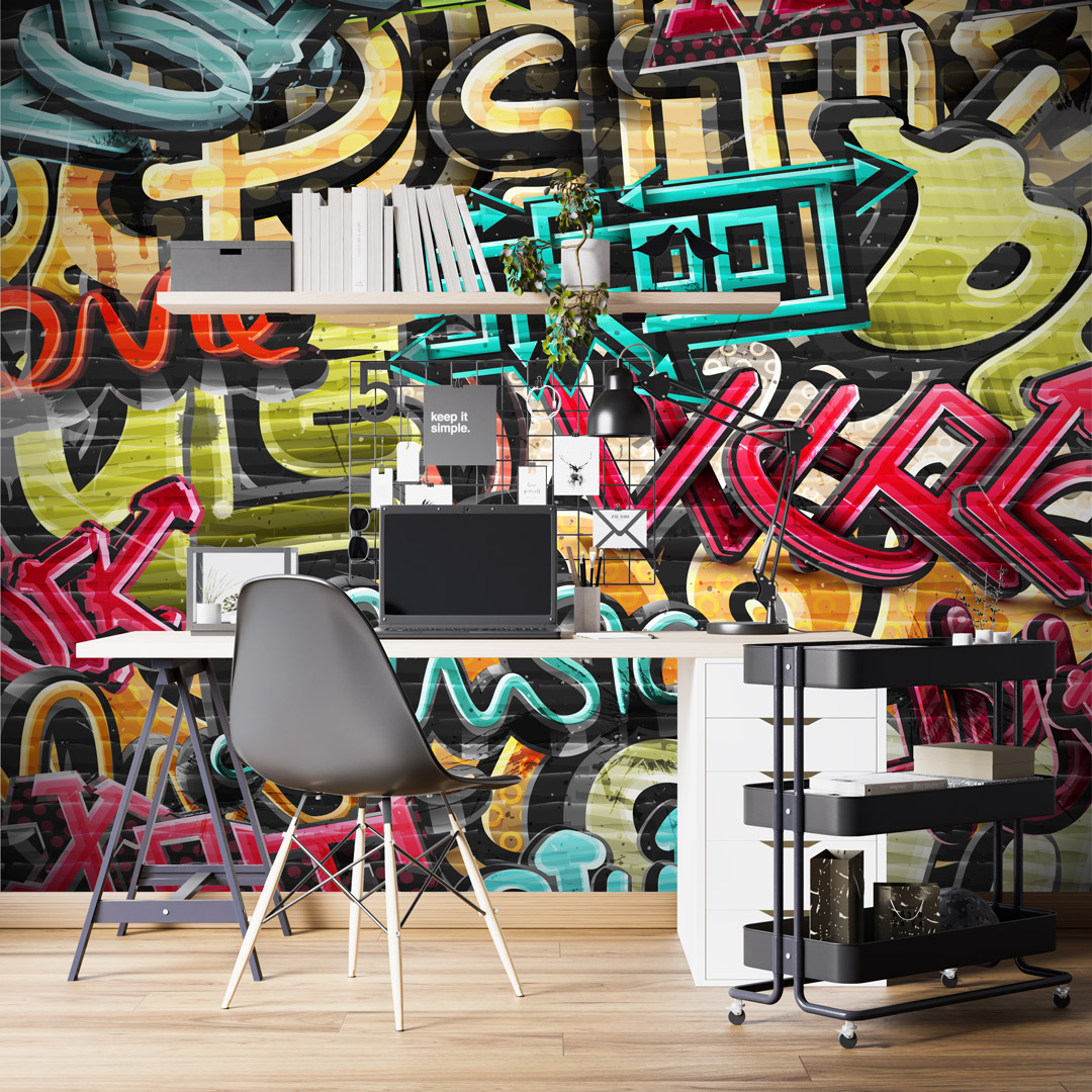 Foto tapeta sa iscrtanim grafitima pruža urban i moderan izgled zida u savremenim prostorima.