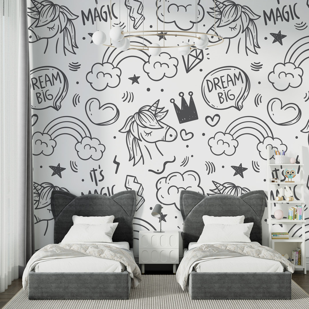 Dečija foto tapeta sa motivom jednoroga stvara bajkovitu i nežnu atmosferu u prostoru.