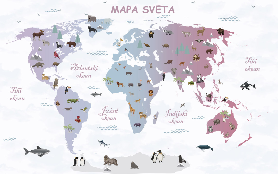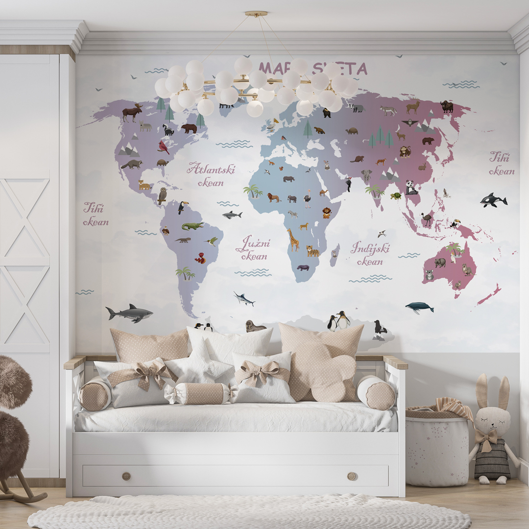 Tapeta s kartom sveta za decu živopisno prikazuje kontinente, životinje i znamenitosti, pretvarajući zid u edukativnu i zabavnu avanturu!