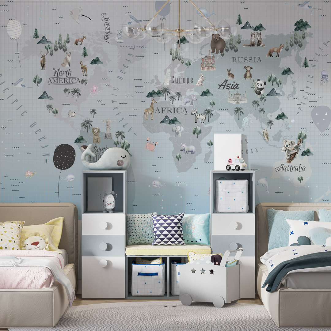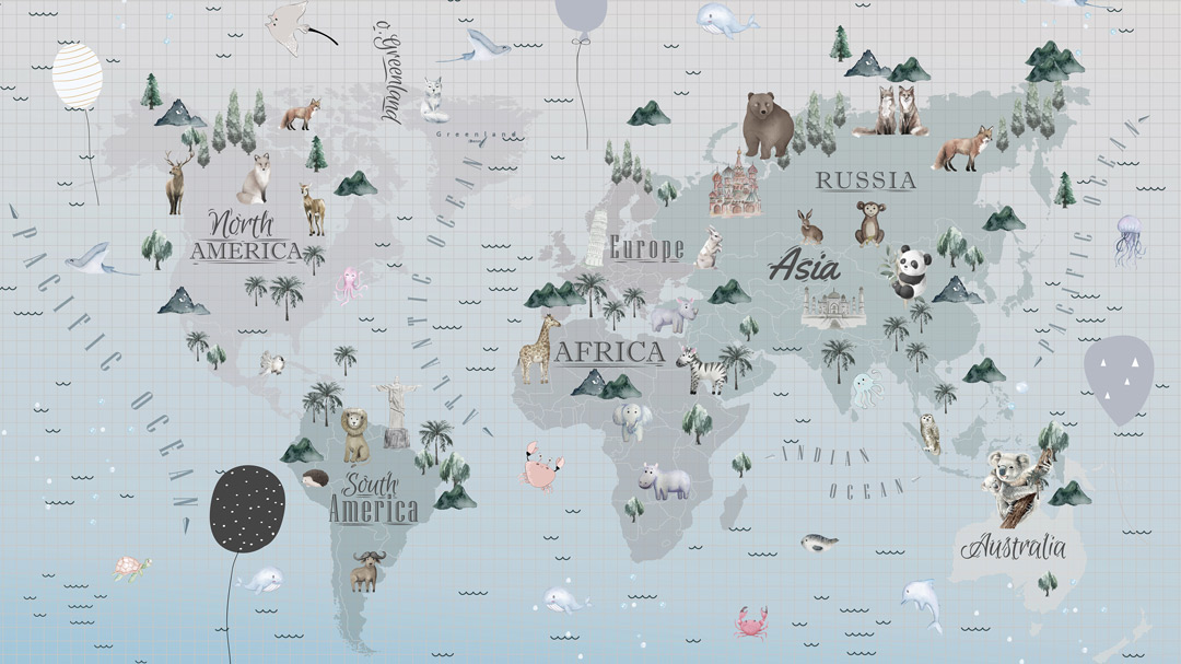 Tapeta s kartom sveta za decu živopisno prikazuje kontinente, životinje i znamenitosti, pretvarajući zid u edukativnu i zabavnu avanturu!