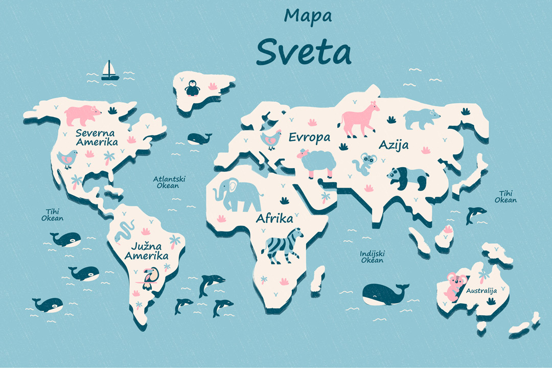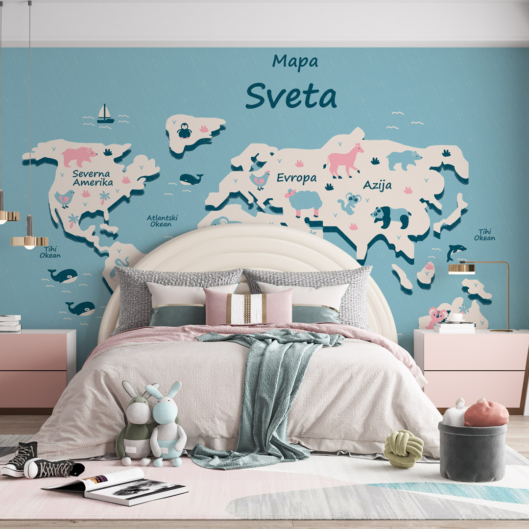 Foto tapeta sa motivom karte sveta namenjena je edukativnim i dečijim prostorima. Vizuelni prikaz sveta pomaže učenju geografije i razumevanju prostora.