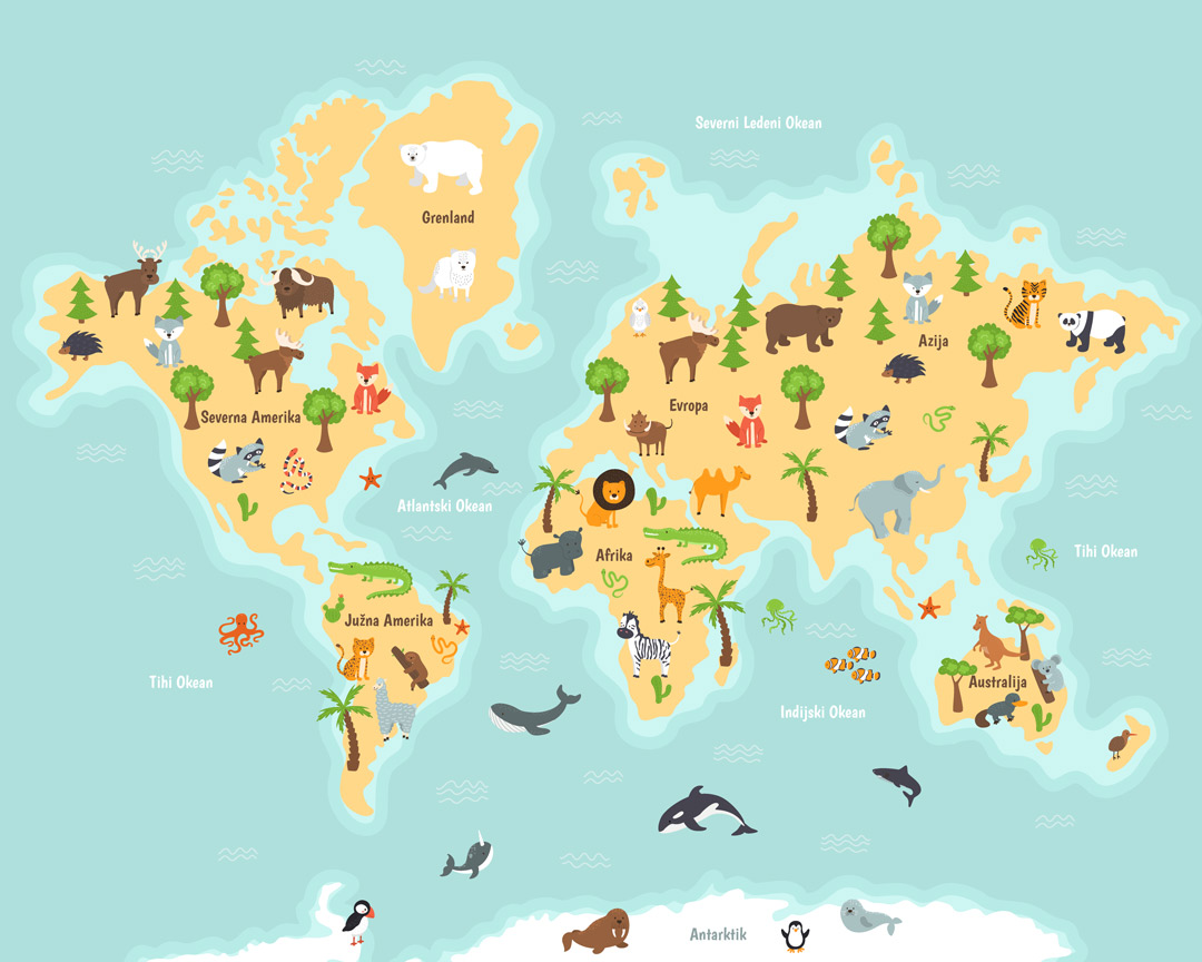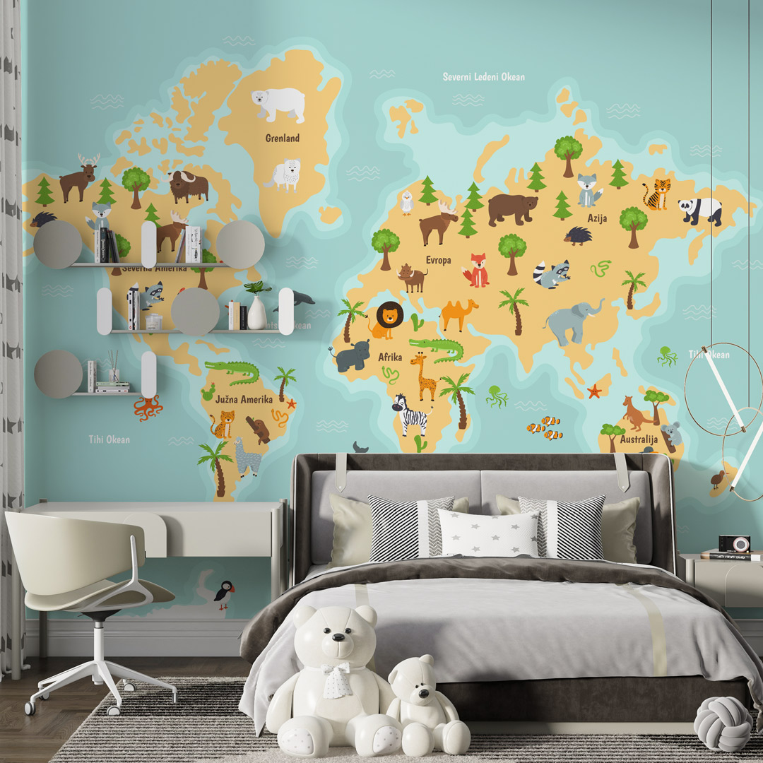 Foto tapeta sa motivom karte sveta idealna je za dečije sobe i edukativne prostore. Dizajn omogućava deci da kroz svakodnevni boravak u prostoru upoznaju kontinente i svet na vizuelno zanimljiv način, uz izradu po meri zida.