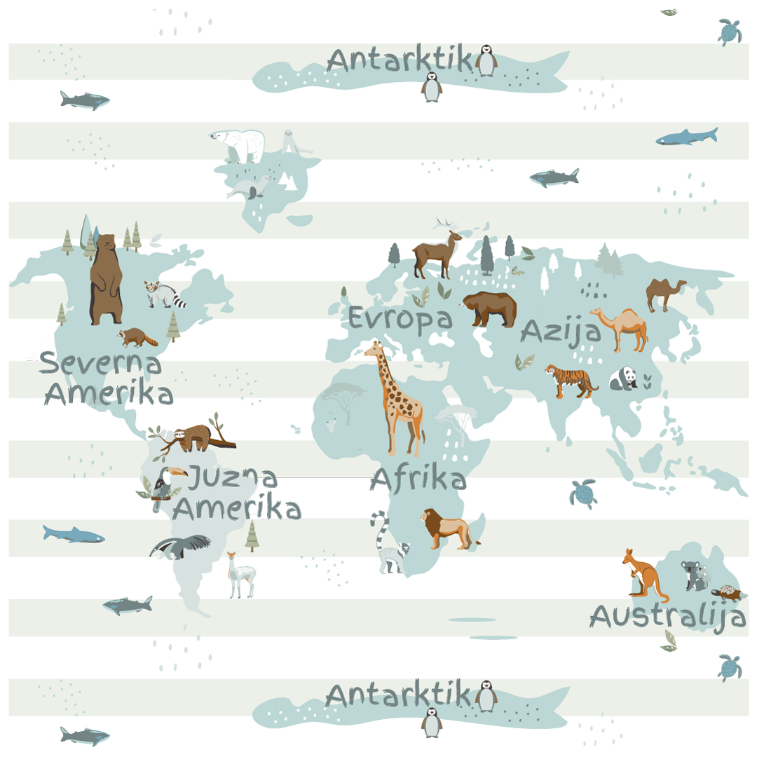 Ova foto tapeta sa motivom karte sveta namenjena je edukativnim i dečijim prostorima. Dizajn pruža jasan vizuelni prikaz sveta, pogodan za učenje i dekoraciju.