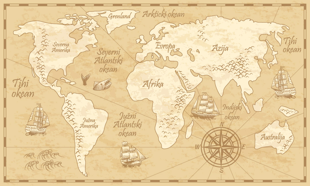 Foto tapeta sa klasičnim motivom karte sveta predstavlja dekorativno i edukativno rešenje za dečije i radne prostore. Idealna je za učenje geografije kroz vizuelni prikaz.