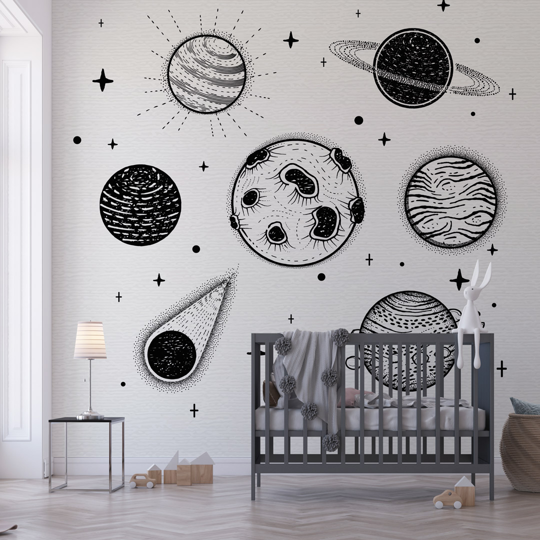 Dečija foto tapeta sa motivom kosmosa donosi svemirski ambijent u prostor. Idealna je za decu koja vole planete, zvezde i istraživanje svemira, stvarajući maštovitu atmosferu.