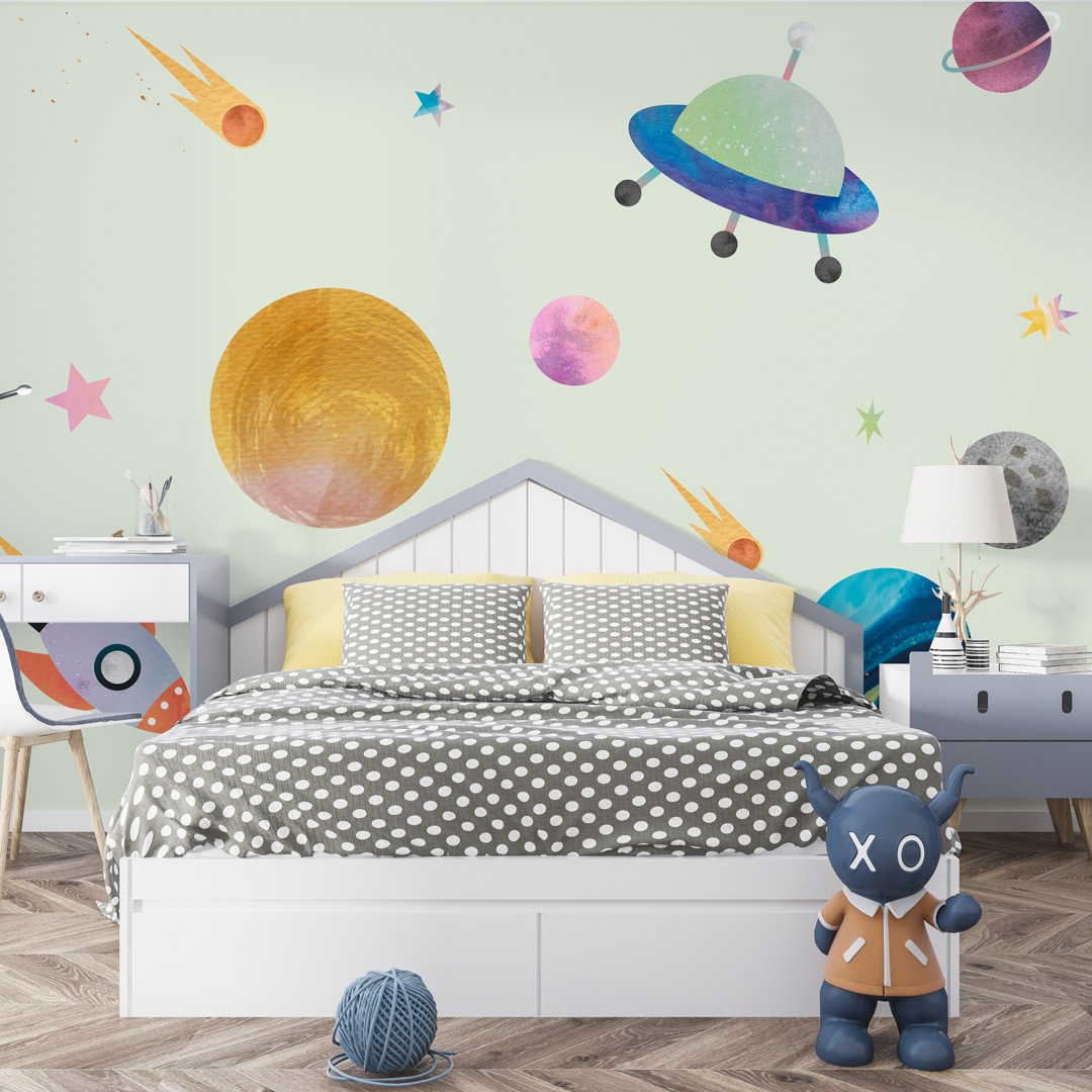 Dečija foto tapeta sa motivom kosmosa donosi svemirski ambijent u prostor. Idealna je za decu koja vole planete, zvezde i istraživanje svemira, stvarajući maštovitu atmosferu.
