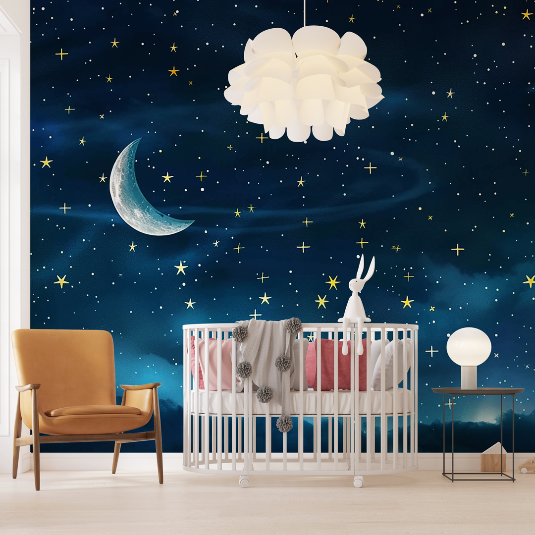 Dečija foto tapeta sa motivima oblaka i zvezda namenjena je stvaranju smirujućeg i toplog prostora. Dizajn je idealan za dečije sobe i kutke za odmor.