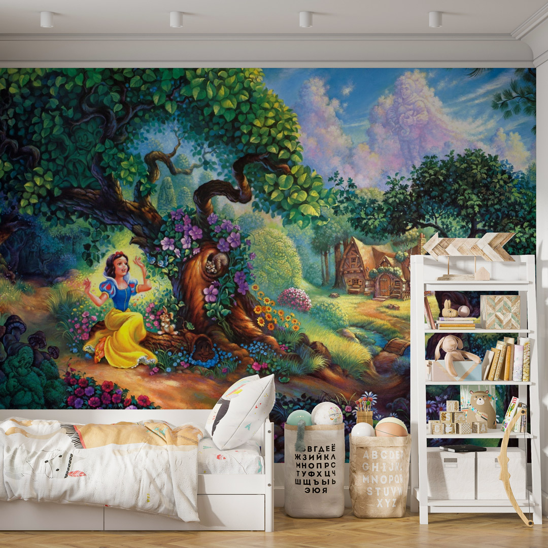 Dečija foto tapeta sa motivima Snežane i sedam patuljaka stvara bajkovitu i toplu atmosferu u dečijoj sobi.